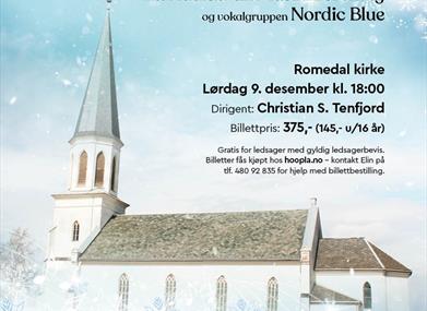 Vi gjentar fjorårets suksess og inviterer til en flott og stemningsfull julekonsert med Ådalsbruk Musikkforening og vokalgruppen Nordic Blue i vakre Romedal kirke!