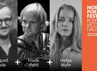 Jacobsens dikt Pusteøvelse. Med seg har han Helga Myhr og Frode Haltli. Kan
