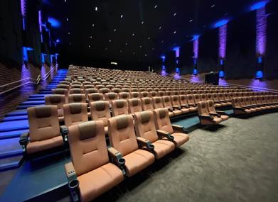 140 seter. Digital projeksjon og lyd. MasterImage-3D-system, sølvlerret. Bakerste rad har ekstra komfortable skinnseter (pristillegg).